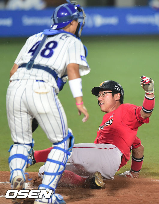 24일 오후 대구 시민구장에서 열린 '2014 한국야쿠르트 세븐 프로야구' 삼성 라이온즈와 SK 와이번스의 경기 8회초 무사 2,3루 임훈의 희생플라이에 3루주자 박정권이 득점하고 있다.
