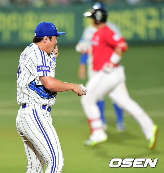 24일 오후 대구 시민구장에서 열린 '2014 한국야쿠르트 세븐 프로야구' 삼성 라이온즈와 SK 와이번스의 경기 8회초 2사 3루 정상호에게 투런홈런을 허용한 안지만이 마운드에서 땀을 닦고 있다.