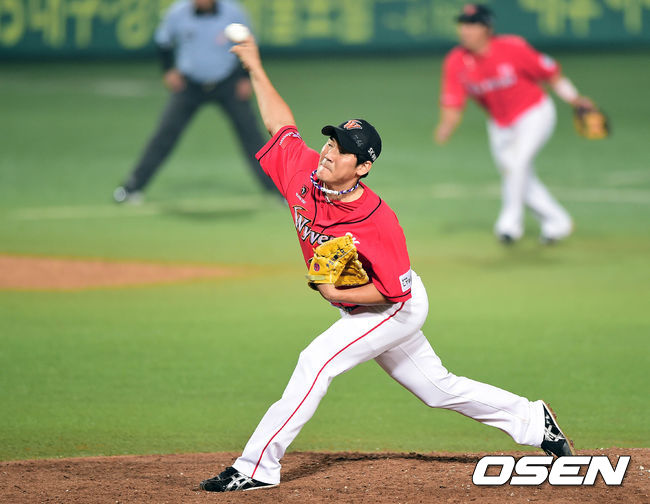 24일 오후 대구 시민구장에서 열린 '2014 한국야쿠르트 세븐 프로야구' 삼성 라이온즈와 SK 와이번스의 경기 9회말 무사 1루 마운드에 올라온 윤길현이 역투하고 있다.
