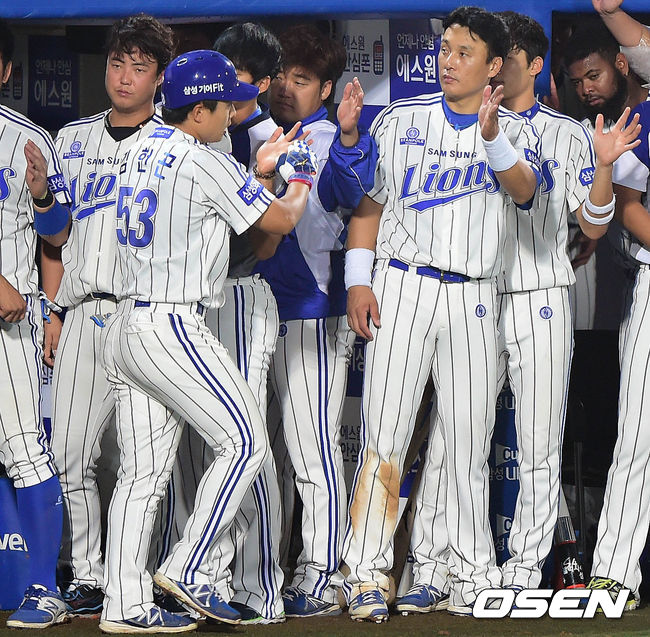 24일 오후 대구 시민구장에서 열린 '2014 한국야쿠르트 세븐 프로야구' 삼성 라이온즈와 SK 와이번스의 경기 9회말 2사 2루 김헌곤이 투런홈런을 치고 덕아웃에서 동료들과 하이파이브를 하고 있다.