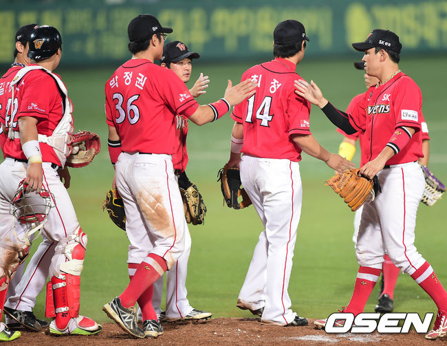 24일 오후 대구 시민구장에서 열린 '2014 한국야쿠르트 세븐 프로야구' 삼성 라이온즈와 SK 와이번스의 경기 종료 후 SK 선수들이 하이파이브를 하고 있다.