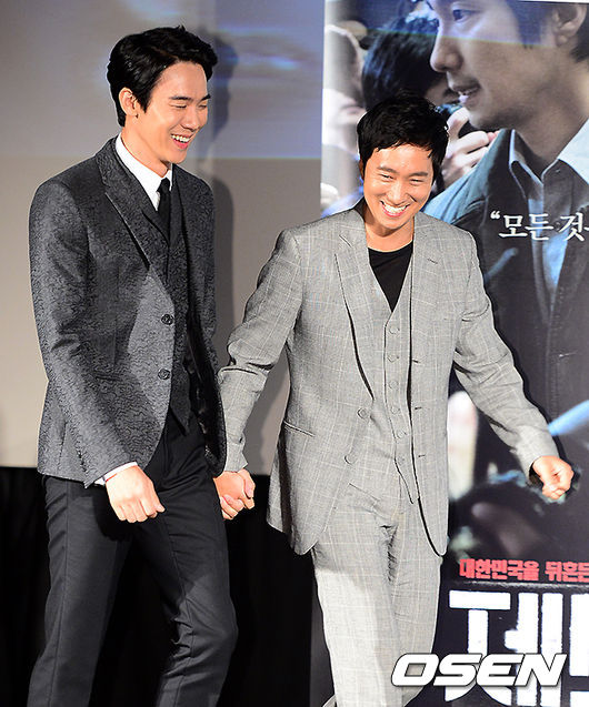 유연석, 박해일이 손을 잡고 다정하게 무대에 오르고 있다.