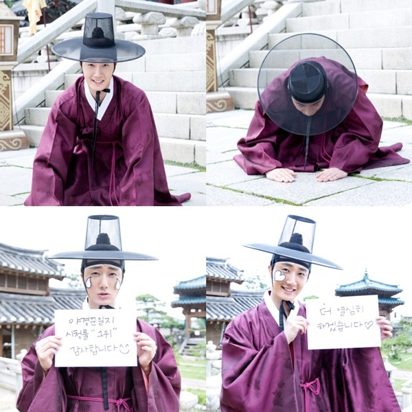 정일우는 25일 공개된 사진 속에서 시청률 1위에 대한 감사 인사를 전하는 모습이다. 사진 속 정일우는 이린의 의상인 자주색 빛이 고운 도포를 갖춰 입고 가지런히 두 손을 모으고 고개 숙여 큰절을 올리고 있다.