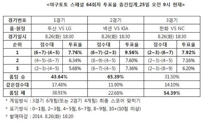 KBO 3경기 대상 야구토토 스페셜 64회차 투표율 중간집계