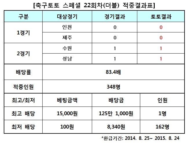 국민체육진흥공단(www.kspo.or.kr)이 발행하는 국민체육진흥투표권 수탁사업자인 스포츠토토(www.sportstoto.co.kr)는 지난 24일 벌어진 인천-제주(1경기), 수원-성남(2경기)의 K리그 클래식 2경기를 대상으로 한 축구토토 스페셜 22회차 더블 게임에서 2경기의 결과를 정확히 맞힌 참가자가 모두 348명이 나와 각각 베팅 금액의 83.4배에 해당하는 적중상금을 가져가게 됐다고 밝혔다.