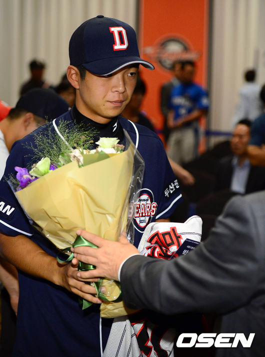 두산베어스 5라운드 지명 세광고 박종욱이 유니폼으로 옷을 갈아 입고 꽃다발을 받고 있다.
