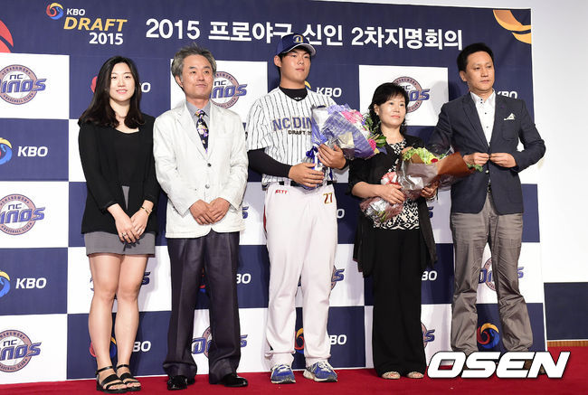 경희대 이호중이 NC다이노스 1차지명 선수로 선발되어 가족,단장과 함께 포토타임을 갖고 있다.