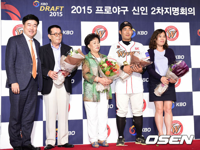 동국대 이현석이 SK 와이번스 1차지명 선수로 선정되어 단장,가족과 포토타임을 갖고 있다.