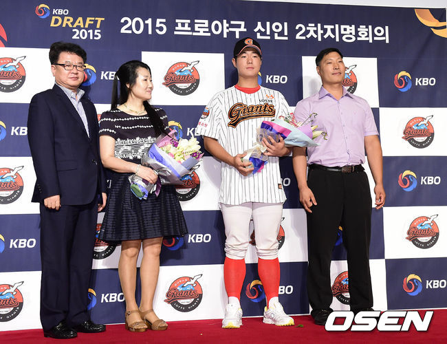 부경고 강동관이 롯데자이언츠 1차지명 선수로 선정되어 가족,단장과 함께 포토타임을 갖고 있다.