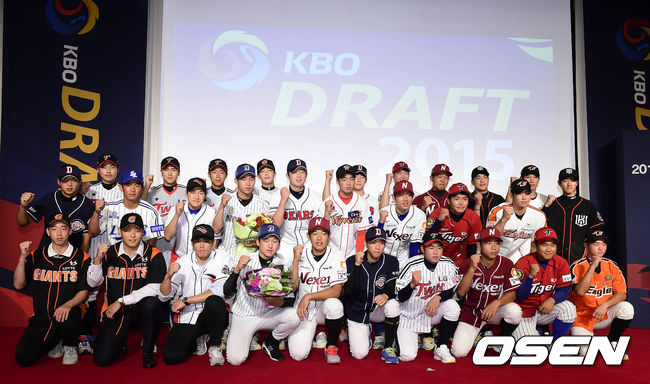 이날 각 구단에 지명된 선수들이 구단의 유니폼으로 갈아 입고 기념촬영을 하고 있다.
