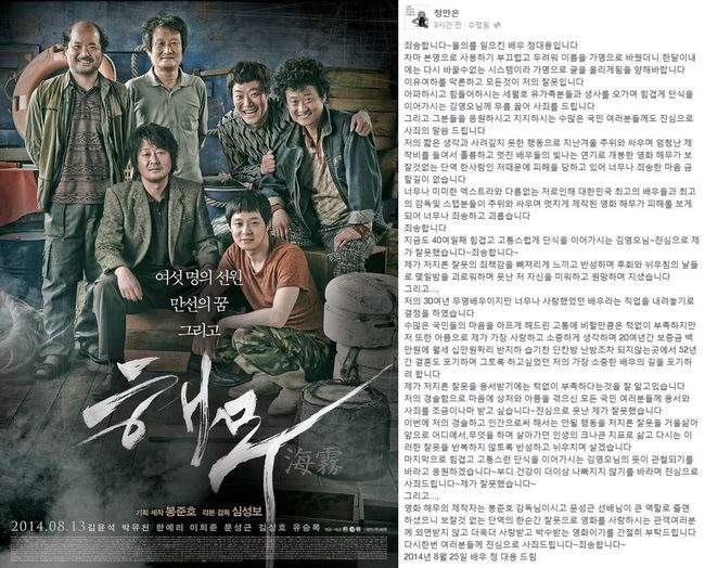 정대용은 "저의 짧은 생각과 사려 깊지 못한 행동으로 지난겨울 추위와 싸우며 엄청난 제작비를 들여서 훌륭하고 멋진 배우들의 빛나는 연기로 개봉한 영화 '해무'가 보잘것없는 단역 한사람인 저 때문에 피해을 당하고 있어 너무나 죄송한 마음 금할 길이 없습니다"며 "너무나 미미한 엑스트라와 다름없는 저로 인해 대한민국 최고의 배우들과 최고의 감독 및 스텝분들이 추위와 싸우며 멋지게 제작된 영화 해무가 피해를 보게 되어 너무나 죄송하고 괴롭습니다. 죄송합니다"라며 영화 '해무'의 보이콧 논란을 언급했다.