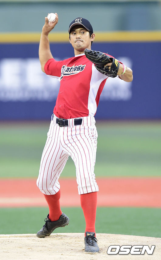 25일 오후 서울 목동야구장에서 '다문화 가정과 넥센히어로즈가 함께하는 한은회-연예인 올스타 자선 야구경기', 1회초 A팀 선발 투수 배우 오지호가 힘차게 공을 던지고 있다.