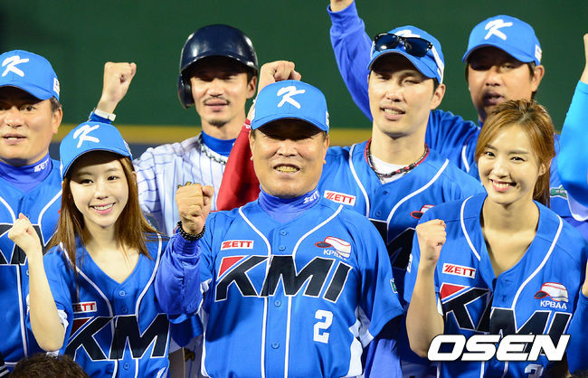25일 오후 서울 목동야구장에서 '다문화 가정과 넥센히어로즈가 함께하는 한국프로야구은퇴선수협회(이하 한은회)-연예인 올스타 자선 야구경기', 경기종료후 아나운서 황보미, 백인천 단장, 정인영 아나운서가 기념촬영을 하고 있다.