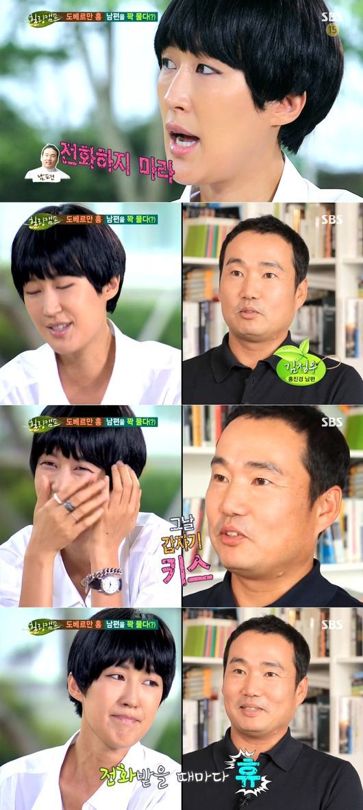 홍진경은 25일 오후 방송된 SBS 예능프로그램 ‘힐링캠프, 기쁘지 아니한가’(이하 ‘힐링’)에서 남편과의 첫만남에 대해 “처음 만난 날 키스를 했다”고 고백했다.