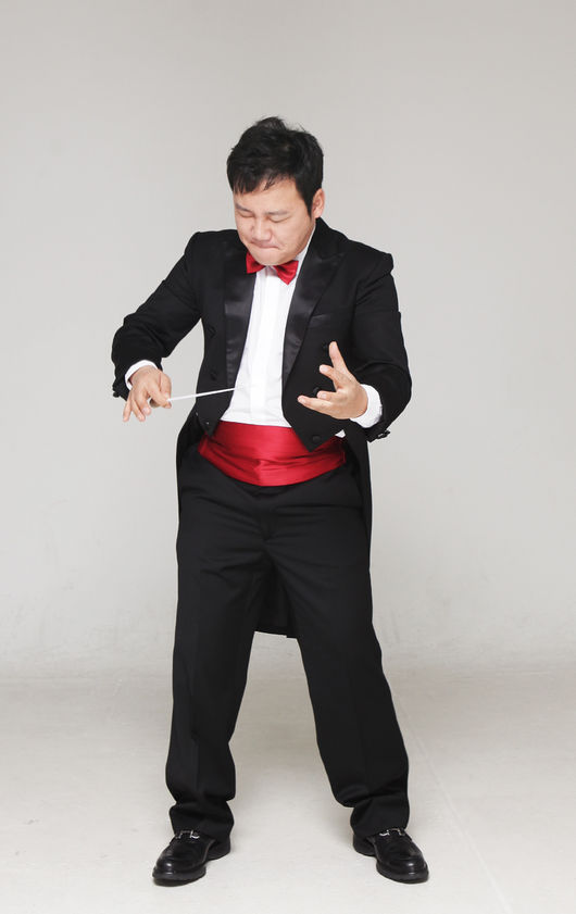 개그맨 김현철이 지휘 퍼포먼스를 위해 연습에 매진 중이다.