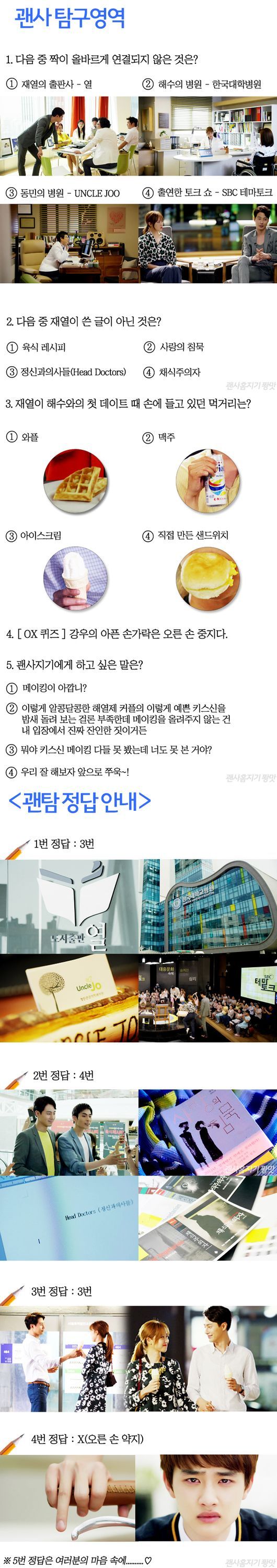 그리고 극 중 인기작가인 재열이 쓴 글이 아닌 내용을 찾는 질문과 재열이 해수와 첫 데이트 때 손에 들고 있던 음식에 대한 질문과 강우(디오 분)가 아파하는 손가락을 묻는 디테일한 문제가 선보이기도 했다.