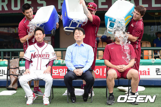 26일 오후 서울 목동야구장에서 열리는 '2014 한국야쿠르트 세븐 프로야구' 넥센 히어로즈와 KIA 타이거즈의 경기를 앞두고, 넥센 이장석 대표, 염경엽 감독, 이택근이 아이스 버킷 챌린지를 하고 있다.
