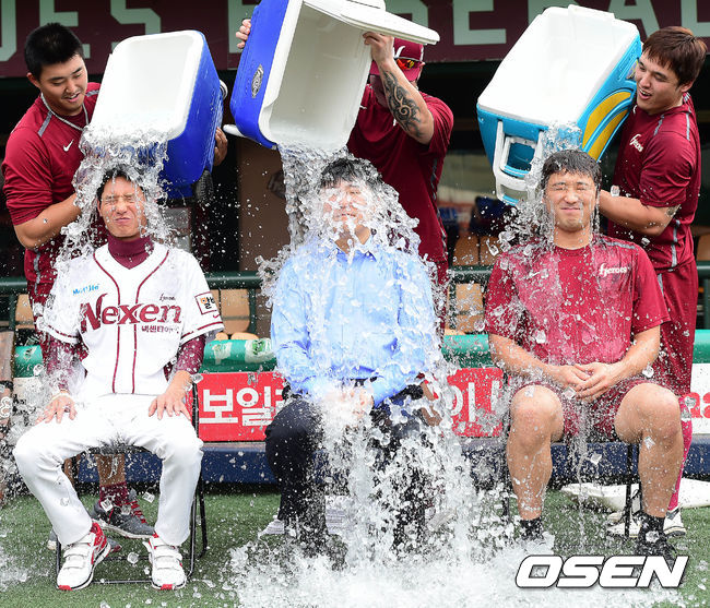26일 오후 서울 목동야구장에서 열리는 '2014 한국야쿠르트 세븐 프로야구' 넥센 히어로즈와 KIA 타이거즈의 경기를 앞두고 넥센 이장석 대표, 염경엽 감독, 이택근이 아이스 버킷 챌린지를 하고 있다.