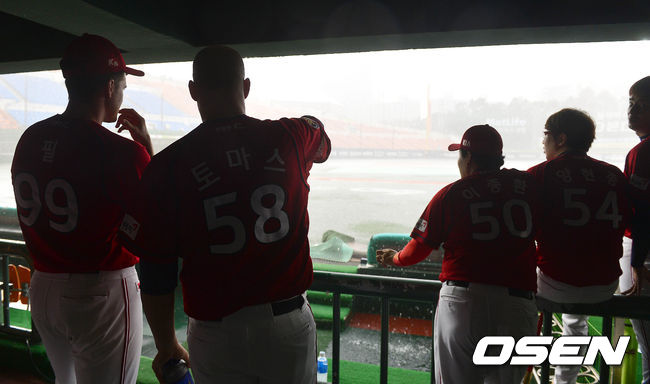 KIA 선수들이 비 내리는 그라운드를 바라보고 있다./dreamer@osen.co.kr