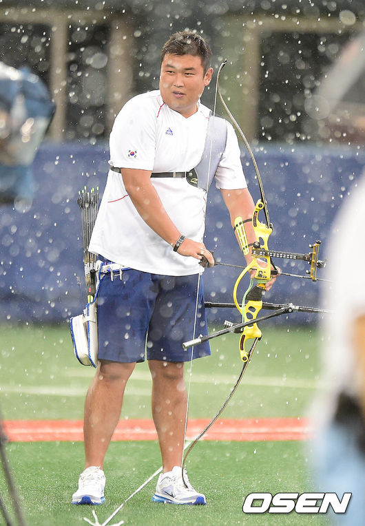 남자 양궁대표 오진혁이 장대비 속에서 훈련을 진행하고 있다.