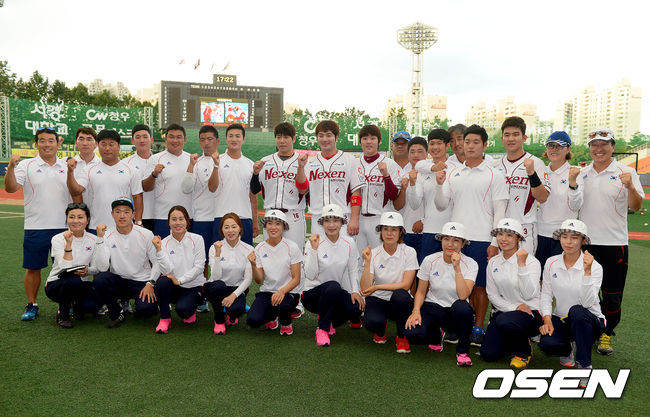 남여 양궁 대표팀 선수들과 코칭스태프, 넥센 강정호-박병호-한현희가 기념촬영을 하고 있다.