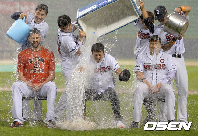 시구가 예정됐던 배우 류승수가 경기가 우천으로 취소되자 두산 니퍼트, 홍성흔과 함께 아이스버킷챌린지를 하고 있다. /sunday@osen.co.kr