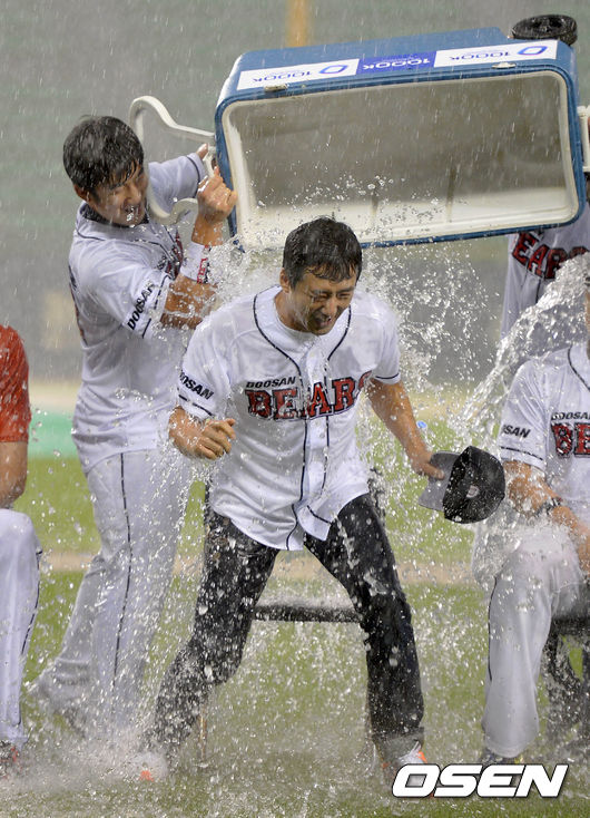 시구가 예정됐던 배우 류승수가 경기가 우천으로 취소되자 두산 니퍼트, 홍성흔과 함께 아이스버킷챌린지를 하고 있다. /sunday@osen.co.kr