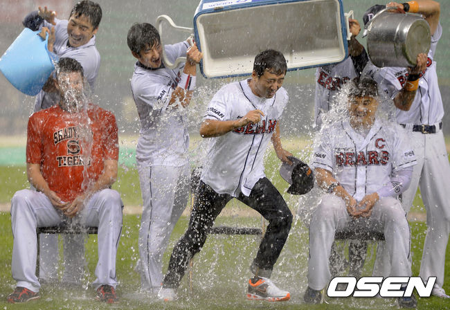 시구가 예정됐던 배우 류승수가 경기가 우천으로 취소되자 두산 니퍼트, 홍성흔과 함께 아이스버킷챌린지를 하고 있다. /sunday@osen.co.kr