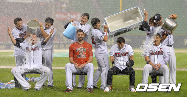 시구가 예정됐던 배우 류승수가 경기가 우천으로 취소되자 두산 칸투, 니퍼트, 홍성흔과 함께 아이스버킷챌린지를 하고 있다. /sunday@osen.co.kr