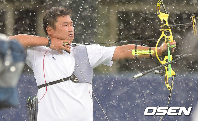 남자 양궁 오진혁이 장대비를 맞으며 활 시위를 당기고 있다.