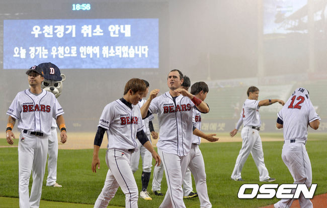 우천으로 잠실 경기가 연기되자 두산 선수들이 팬들에게 인사를 한 후 더그아웃으로 가고 있다. /sunday@osen.co.kr