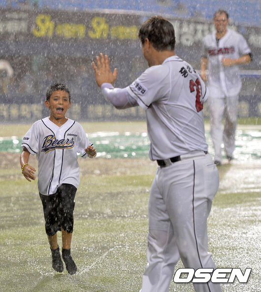 두산 칸투의 아들이 홍성흔과 우천 세리머니를 펼치고 있다. /sunday@osen.co.kr