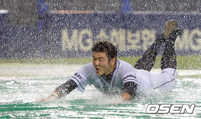 우천으로 경기가 취소되자 두산 최주환이 우천세리머니를 하고 있다. /sunday@osen.co.kr