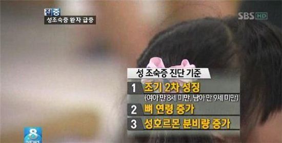 지난 25일 새정치민주연합 인재근 의원의 조사에 따르면 성조숙증 환자가 2009년 2만1712명에서, 2013년 6만6395명으로 3배 이상 증가한 것으로 나타났다.