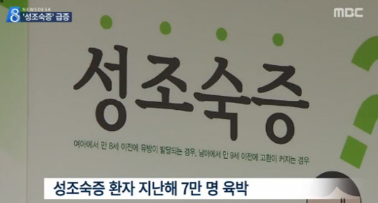 지난 25일 새정치민주연합 인재근 의원의 조사에 따르면 성조숙증 환자가 2009년 2만1712명에서, 2013년 6만6395명으로 3배 이상 증가한 것으로 나타났다.