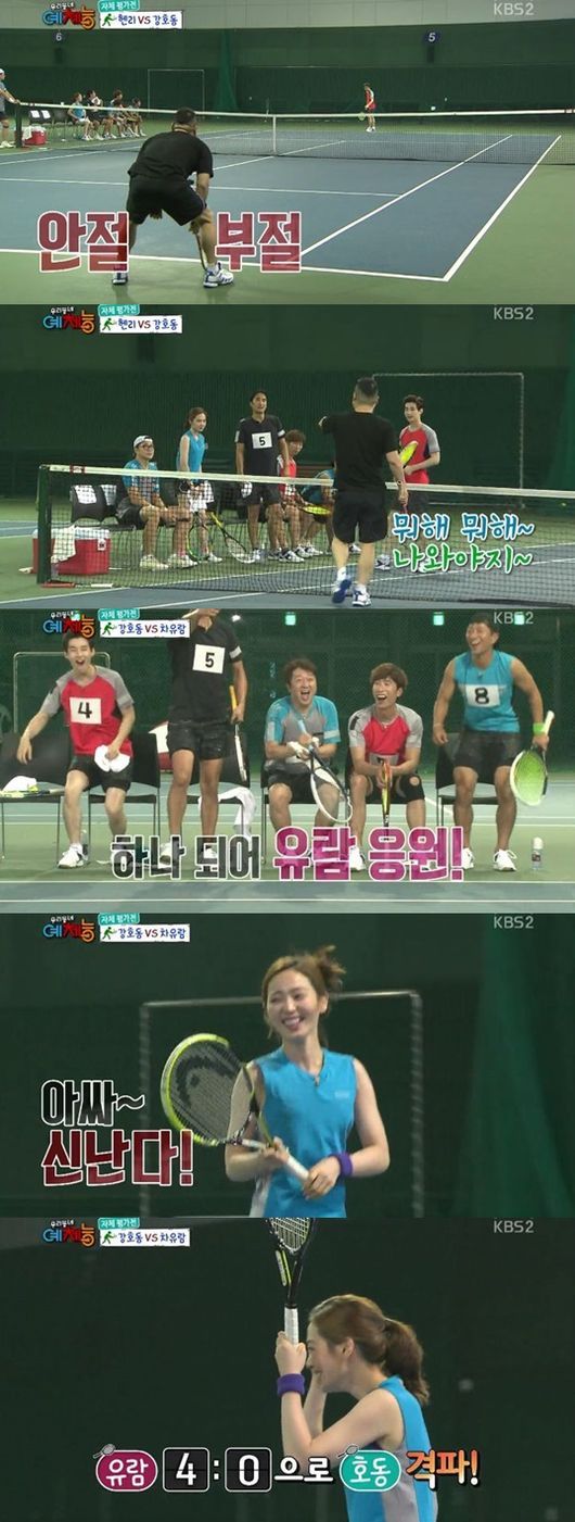 이날 강호동은 자신의 테니스 실력을 과시하며, 헨리를 꺾으며 승승장구 하며 목소리를 높였다. 하지만 이후 맞붙은 상대는 바로 '당구의 여신' 차유람. 차유람은 모든 이들의 응원을 한 몸에 받으며 의외의 실력을 뽐냈고, 강호동은 차유람에 4대0으로 참패해 무릎을 꿇었다.