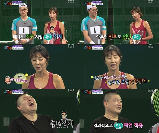 26일 오후 방송된 KBS 2TV '우리동네 예체능'(이하 '예체능')에서는 자체평가전을 끝내고 훈련을 위해 테니스스타 이형택과 전미라를 전담코치로 초청한 멤버들의 모습이 그려졌다.