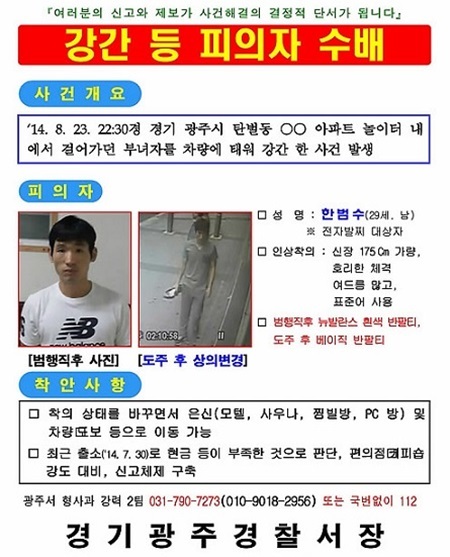 한씨는 23일 오후 10시 30분쯤 경기도 광주시 한 골목길에서 귀가하던 A(22·여)씨를 납치, 성폭행한 뒤 송수신기를 버리고 도주한 혐의를 받고 있다.