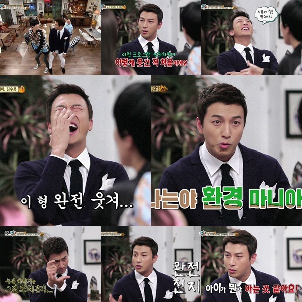 MC들이 김수용이 뉴스마니아임을 언급하며 뉴스를 많이 보는 이유를 묻자 “시간도 많고 하루에 20시간 정도 있다. 하루에 4시간 잔다. 고3인 줄 알았다”는 김수용의 말에 박건형이 빵 터졌다. 김수용의 입담에 박건형은 눈물이 날 정도로 격한 리액션을 보였고 얼굴까지 빨개졌다. 박건형은 “이런 프로그램 녹화하면서 이렇게 웃긴 적 처음이다”며 김수용을 향한 눈빛이 변했다.