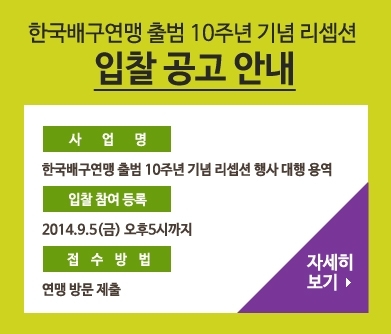 한국배구연맹(총재 구자준)은 출범 10주년 기념 리셉션 행사 진행을 점담할 대행업체의 입찰 공고를 실시한다.