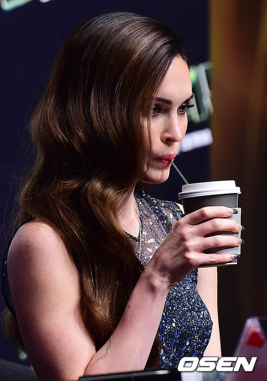27일 오후 서울 신라호텔에서 열린 영화 '닌자터틀' 기자간담회에서 메간 폭스가 음료를 마시고 있다.
