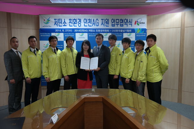 2014 인천아시아경기대회 조직위원회(위원장 김영수)는 인천아시안게임의 성공적인 저탄소 친환경 개최를 위해 27일 오전 송도 미추홀타워 조직위 영상회의실에서 사단법인 한국줄넘기협회와 업무협약을 체결했다.