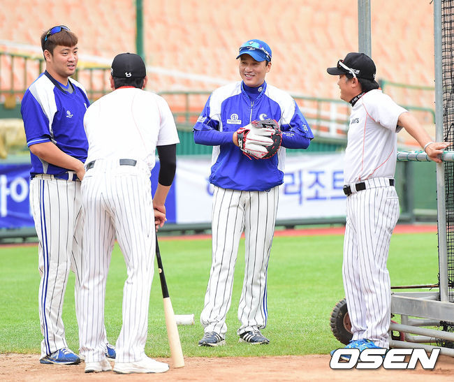 27일 오후 부산 사직구장에서 열리는 '2014 한국야쿠르트 세븐 프로야구' 롯데 자이언츠와 삼성 라이온즈의 경기를 앞두고, 삼성 채태인-이승엽과 롯데 박흥식-김응국 코치가 인사를 나누고 있다.