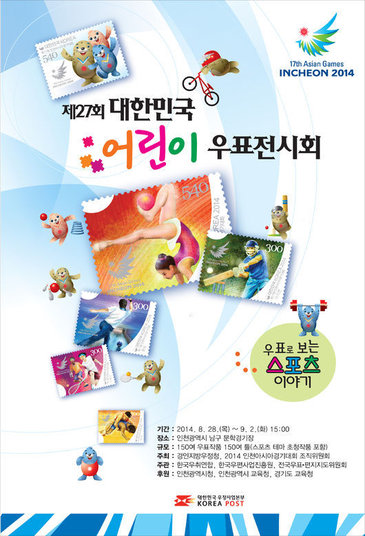 2014 인천아시아경기대회조직위원회는 우정사업본부 경인지방우정청과 공동으로 '제27회 대한민국 어린이 우표전시회'를 28일부터 9일 2일까지 6일간 인천 문학경기장에서 개최한다.