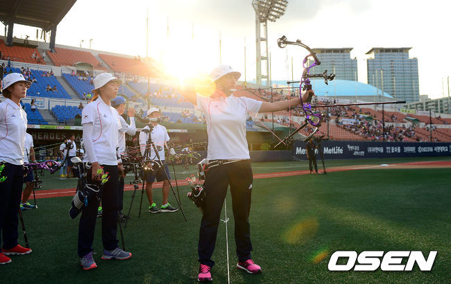 양궁 대표팀은 이번 훈련에서 양궁 경기장 환경과 유사한 환경의 야구장에서 관중의 응원과 함성 가운데 고도의 집중력을 갖고 훈련에 임하는 한편 세계 최강을 자랑하는 한국 양궁 대표팀의 경기를 야구팬들에게 선보였다. / baik@osen.co.kr