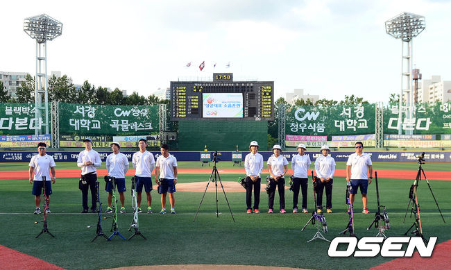 양궁 대표팀은 이번 훈련에서 양궁 경기장 환경과 유사한 환경의 야구장에서 관중의 응원과 함성 가운데 고도의 집중력을 갖고 훈련에 임하는 한편 세계 최강을 자랑하는 한국 양궁 대표팀의 경기를 야구팬들에게 선보였다. / baik@osen.co.kr
