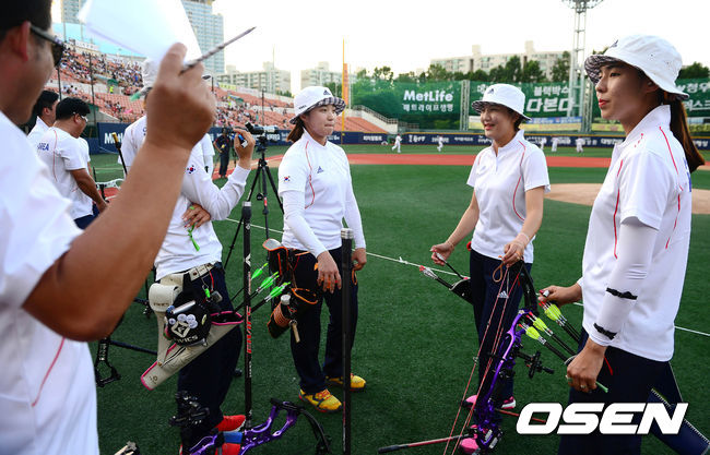 양궁 대표팀은 이번 훈련에서 양궁 경기장 환경과 유사한 환경의 야구장에서 관중의 응원과 함성 가운데 고도의 집중력을 갖고 훈련에 임하는 한편 세계 최강을 자랑하는 한국 양궁 대표팀의 경기를 야구팬들에게 선보였다. / baik@osen.co.kr