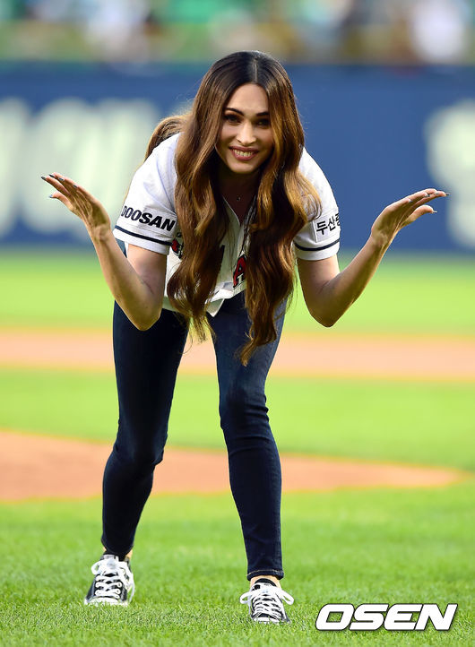 27일 오후 서울 잠실야구장에서 열린 '2014 한국야쿠르트 세븐 프로야구' 두산 베어스와 LG 트윈스의 경기에 앞서 할리우드 스타 메간 폭스가 시구를 한 뒤 세레머니를 하고 있다.