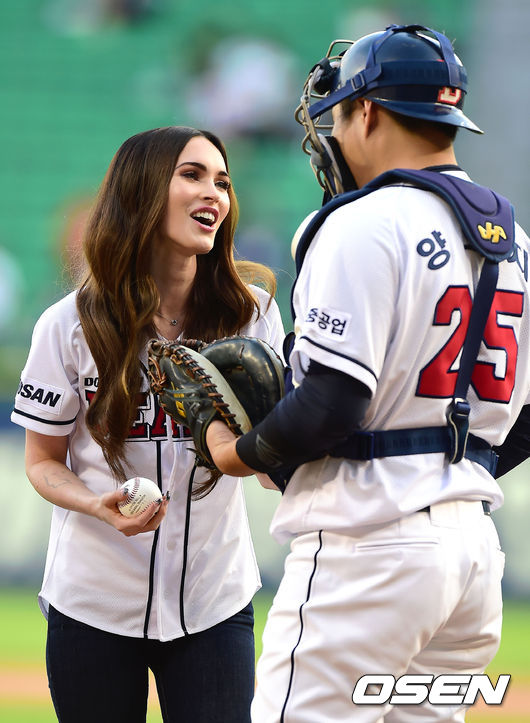 27일 오후 서울 잠실야구장에서 열린 '2014 한국야쿠르트 세븐 프로야구' 두산 베어스와 LG 트윈스의 경기에 앞서 할리우드 스타 메간 폭스가 시구를 마친 뒤 두산 양의지와 이야기를 나누고 있다.