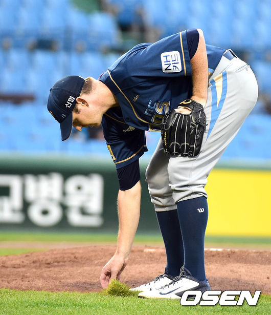 27일 대전야구장에서 벌어진 '2014 한국 야쿠르트세븐 프로야구' 한화 이글스와 NC 다이노스의 경기,1회말 1루 커버를 들어가다 잔디에 걸려 넘어질뻔한 찰리가 잔디를 손질하고 있다.
